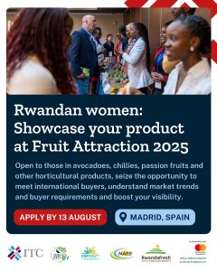 Trade Fair Opportunity for Agrifood Businesses on  30th September –  2nd  October 2025, IFEMA, Madrid, Spain. This opportunity is open to Rwandan women-led businesses interested in participating in Fruit Attraction 2025 Trade Fair, which is organized by the International Trade Centre (ITC) in collaboration with the PSF Specialised Cluster-the SheTrades Rwanda Hub. Apply by Wednesday 13 August 2025.